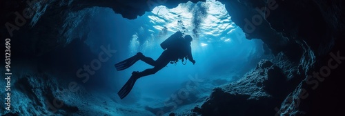 Fototapeta premium Diver exploring underwater rocky cave in deep sea.