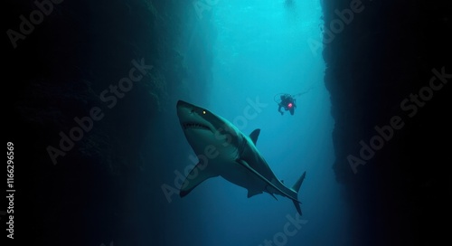 © edisetiawan.id, Fototapeta premium Diver Facing a Great White Shark in the Deep Ocean.