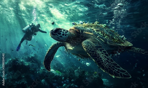 Obraz premium Diver, sea turtle, ocean plastic pollution.