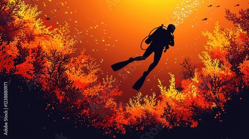 Naklejka premium Diver Silhouette Amidst Vibrant Coral Reef
