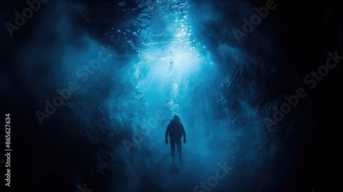 © Ketanoff, Fototapeta premium Diver underwater in the blue sea. Scuba diving in the depths of the sea