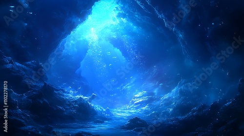 Fototapeta premium Diver venturing into a mystical blue-lit underwater grotto