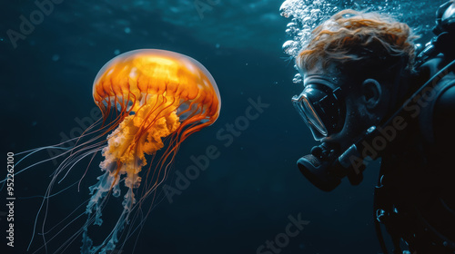 © Joyce, Fototapeta premium Diver watching closely in deep sea at a glowing jelly fish