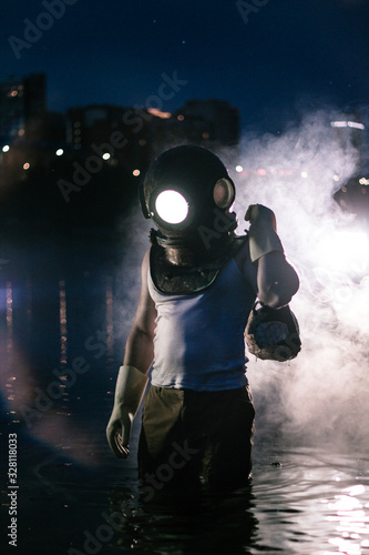 © Igor, Fototapeta premium Diver with garbage stands on a background of sunset in the water.