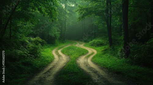 Obraz premium Diverging pathways at a tranquil crossroads in a lush green forest surrounded by dense trees and soft misty light