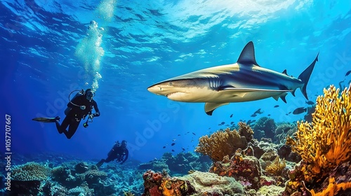 Fototapeta premium Divers Swimming Near Gentle Reef Shark