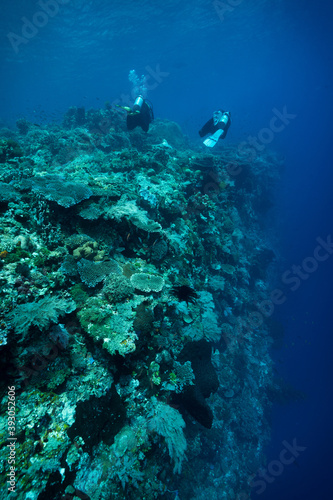 Fototapeta premium Divers underwater on top reef underwater in blue ocean