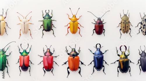 Naklejka premium Diverse array of colorful beetles arranged symmetrically against a white...