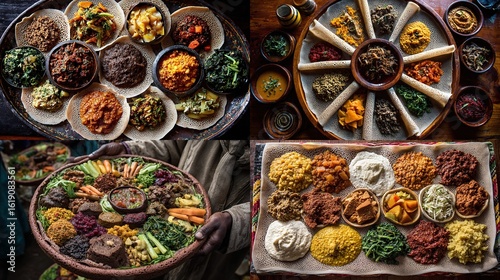 © Bulan, Fototapeta premium Diverse array of Ethiopian food dishes served on various platters