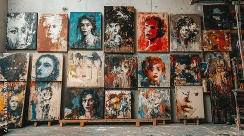 © Sudarat, Obraz premium Diverse Artistic Portraits on Display in Creative Art Studio Environment