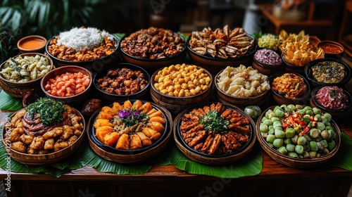 Fototapeta premium Diverse Asian Buffet on Banana Leaves