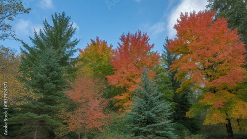 Naklejka premium Diverse autumn forest with vibrant red orange and green foliage under blue sky trees