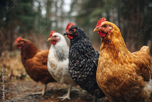 Fototapeta premium Diverse Backyard Hens: Golden, Black, White, and Brown Chickens Lined Up in Natural Setting