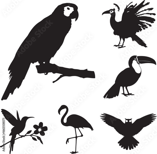© MDAHASAN, Naklejka premium Diverse bird silhouettes on white parrot toucan