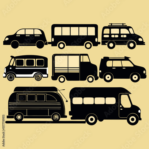Fototapeta premium Diverse black vehicle silhouettes on pale yellow background