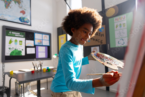 Naklejka premium Diverse boy painting on easel in school art studio with paintbrush and...