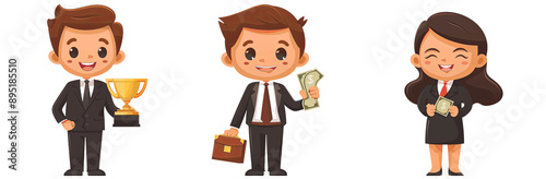 Obraz premium Diverse Business Cartoons: Man with Cash Briefcase, Woman with Success Trophy, Man with Dollar Sign Flat Style Characters