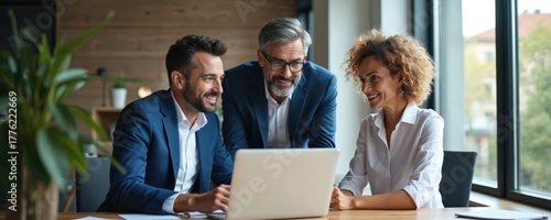 © Vadym, Obraz premium Diverse business people collaborate around laptop in modern office. Smiling colleagues, man and woman, discuss project, share ideas, plan strategy. Teamwork, planning, meeting, corporate life.