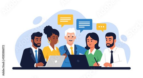 Obraz premium Diverse business team collaborating and communicating effectively during a meeting, using laptops and speech bubbles.