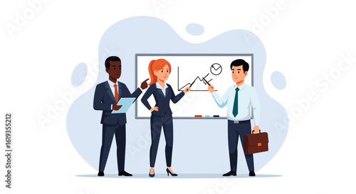 Fototapeta premium Diverse business team presenting data on whiteboard, perfect for landing pages, brochures, and presentations.
