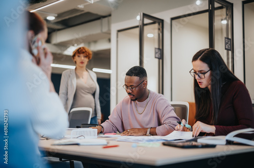 Fototapeta premium Diverse business team working on successful project completion in office.
