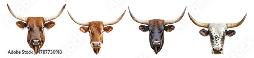 Naklejka premium Diverse Cattle Headshots Displaying Unique Horn Shapes and Colors
