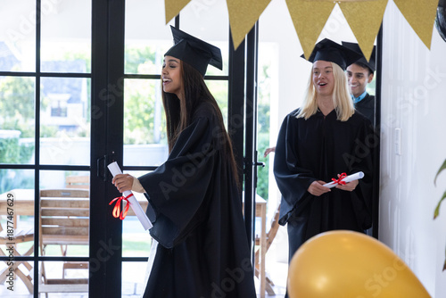 © wavebreak3, Obraz premium Diverse classmates in gowns walking through doors at home holding diploma scrolls, gold balloon