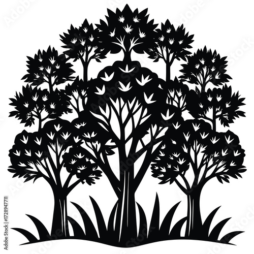 © SHAHNAZ, Obraz premium Diverse cluster of black and white trees in a stylized silhouette design