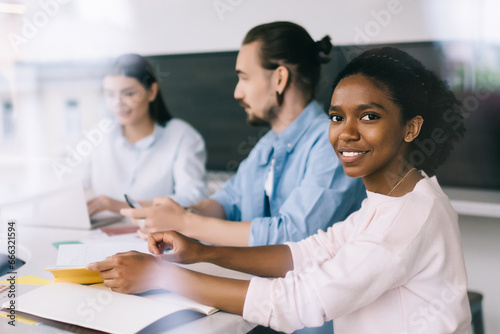 © BullRun, Fototapeta premium Diverse colleagues working at table in office