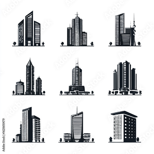 Naklejka premium Diverse collection of abstract city skylines and building silhouettes showcasing modern architectural designs against a clean white background perfect for graphic design elements