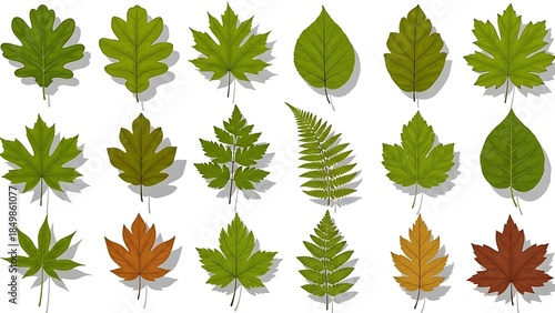 Fototapeta premium Diverse collection of green and autumn leaves on white background