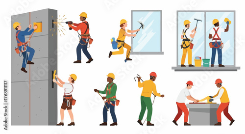 Fototapeta premium Diverse construction workers performing various tasks, including window cleaning, drilling, and working on building facades, in a vector illustration.