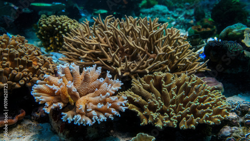 Fototapeta premium Diverse coral formations with branching structures in a vibrant underwater habitat