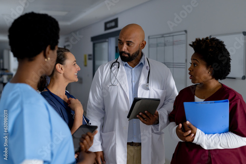 Fototapeta premium Diverse doctors using tablets and discussing work in corridor at hospital