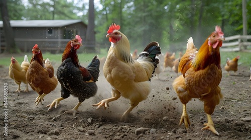 © vanilnilnilla, Fototapeta premium Diverse Free-Range Chicken Flock Dust Bathing in Open Pasture Field