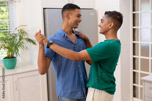 Fototapeta premium Diverse gay male couple spending time in kitchen dancing