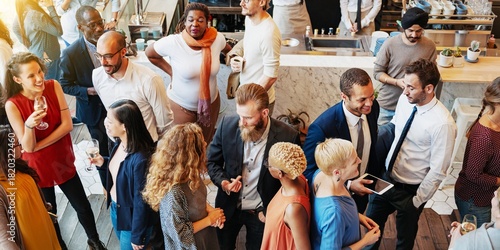 Naklejka premium Diverse group at a social event, people mingling and networking. Mixed gender and ethnicity, lively atmosphere, business and casual attire, social gathering. Diverse business people mingle at event.