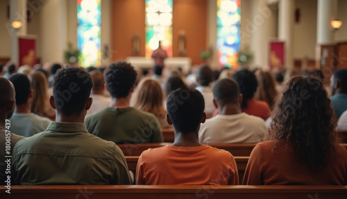 Naklejka premium Diverse group of adults sits in church pews listening to preacher during Sunday sermon. People gather together for worship service in sanctuary, spiritual community engaged.