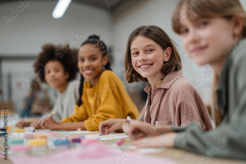 © arko, Fototapeta premium diverse group of enthusiastic volunteers engages with children in vibrant community center