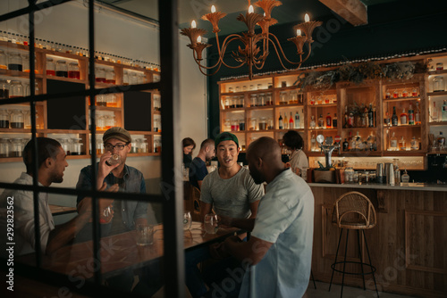 Naklejka premium Diverse group of guys talking over drinks in a bar