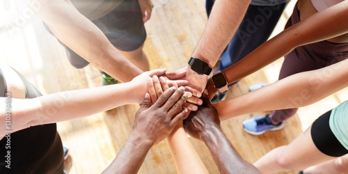 Fototapeta premium Diverse group of men and women, putting hands together in a circle. Teamwork, unity, and collaboration emphasized. Hands in unity, showing teamwork and collaboration. Team stacking hands together.