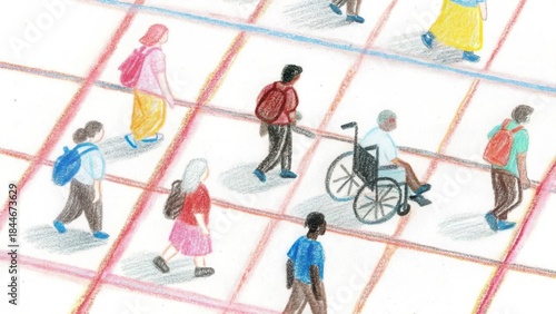 Fototapeta premium Diverse group of people with varying abilities walking on a grid pattern...