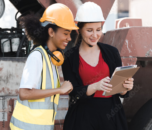 © Nassorn, Fototapeta premium Diverse group of people working together at container yard. As her manager explains, female African American foreman is looking at a tablet screen for cargo delivery. Diversity business people concept