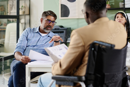 Fototapeta premium Diverse group of professionals discussing documents in modern office environment, with Caucasian man leading conversation and African American man taking notes