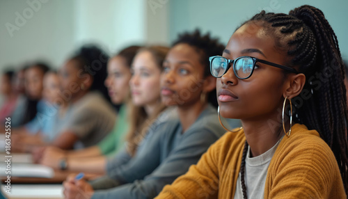 © Vadym, Obraz premium Diverse group of students in classroom setting learning. Young adults pay attention during lesson. Future doctors and nurses study together in lecture hall.