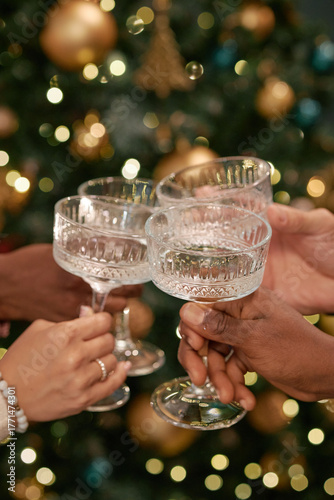 Fototapeta premium Diverse group of young adult men and women clinking crystal glasses in front of decorated Christmas tree, celebrating festive holiday together, hands visible only