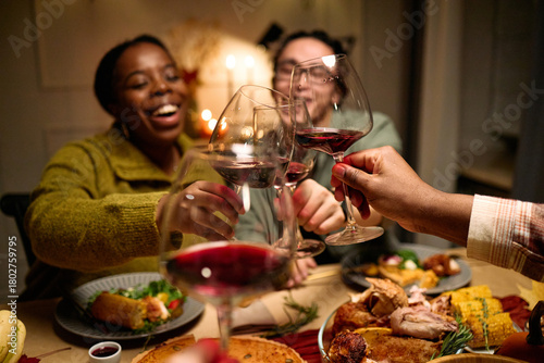 © DragonImages, Obraz premium Diverse group of young people and middle aged friends clinking wine glasses while celebrating Thanksgiving dinner, plates with traditional holiday food on table, smiling and enjoying meal together