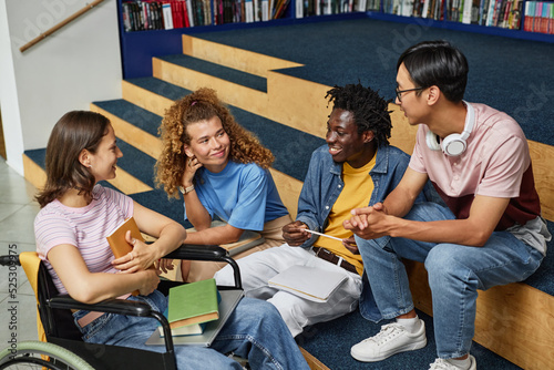 © Seventyfour, Obraz premium Diverse group of young people discussing work in college library including female student with disability