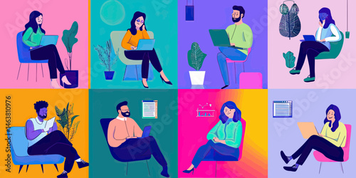 Fototapeta premium Diverse group remote team members working on laptops and tablets in colorful...