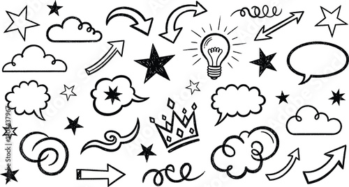 © graphicsobai, Fototapeta premium Diverse hand drawn doodle elements set with stars, clouds, arrows, lightbulb, and crown isolated on white background
